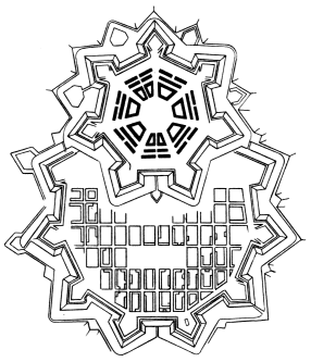 große Festung/Stadt in den Drachenbergen, massiv befestigt Anlage ["Baustilkunde", S. 409, Abb. mitte rechts (Mannheim 1606)], ursprünglich magisch errichtet
